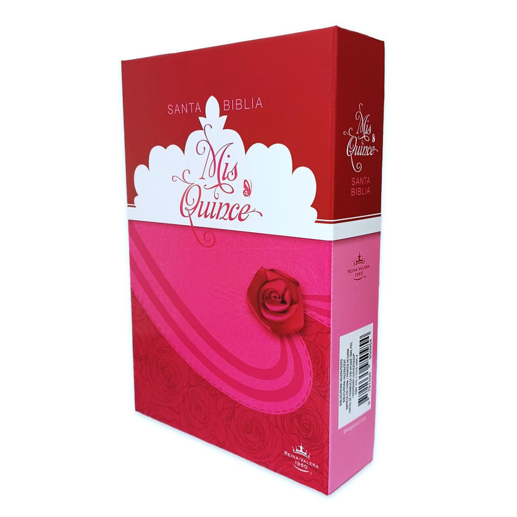 Biblia Mis Quince, con palabras de Cristo en rojo, sección de registro familiar, referencias, 365 citas bíblicas populares, cinta marcadora y caja de regalo.