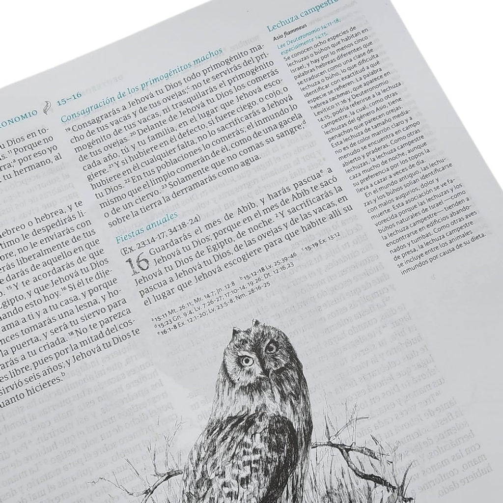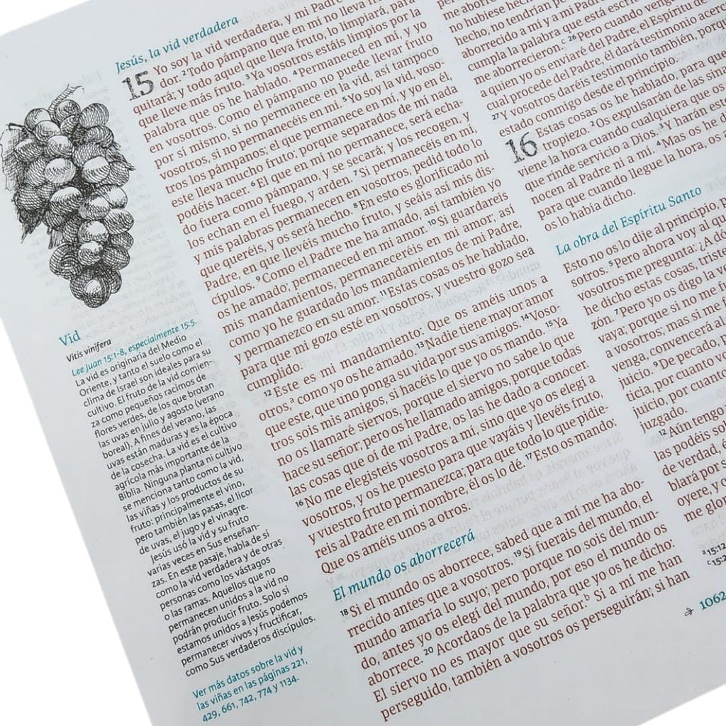 Sumérgete en la belleza de la Palabra de Dios con la RVR 1960 Biblia ilustrada de la creación. Esta hermosa Biblia te ayudará a entender mejor a las personas, la flora y la fauna en el texto bíblico no solamente por medio de espléndidas ilustraciones, sino también por medio de claras explicaciones. El diseño de esta Biblia es especial, pues incluye un margen ancho de 5 centímetros para tus propias anotaciones e ilustraciones. Encontrarás dentro 450 bocetos originales y dibujados a mano sobre la flora mencionada en la Biblia, incluyendo árboles, plantas y flores. Además de eso, los bocetos incluyen animales que aparecen en la Biblia, al igual que 150 personajes bíblicos.