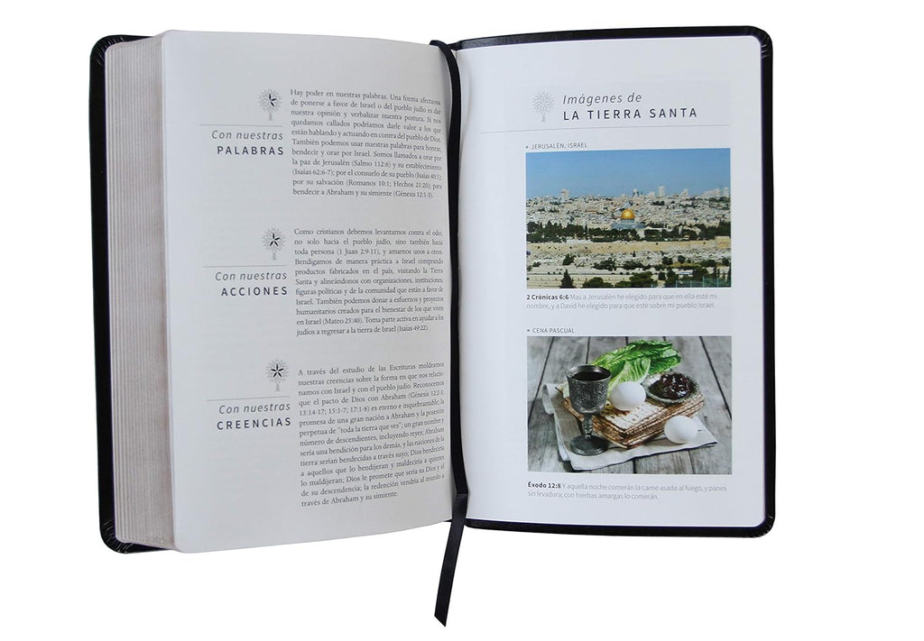 Esta Biblia es perfecta para uso personal o como regalo, gracias a su elegante encuadernación en símil piel negro, página de dedicatoria y cinta marcadora. Con canto dorado, letra grande y las palabras de Cristo resaltadas en rojo, esta edición captura la esencia de Tierra Santa con hermosas imágenes a todo color que invitan a orar por el pueblo de Israel.