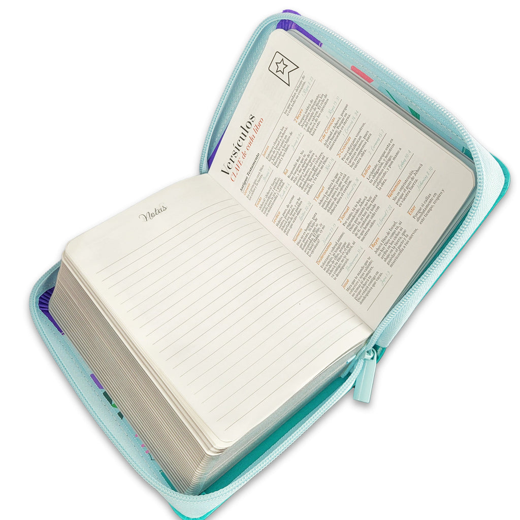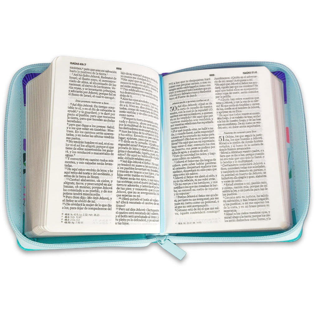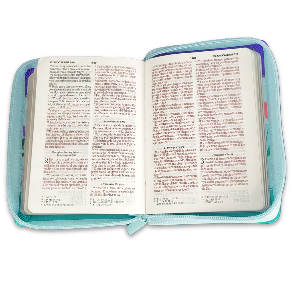 Biblia Reina Valera 1960 · 10x14 cm · Letra pequeña 8,5 pt · Con cierre · Tapa imitación piel · Colección Primor mariposa lila, azul y turquesa